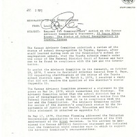 Louis Nunez of the United States Commission on Civil Rights issues a memo requesting commissioners of other federal agencies to take action on the Kansas Advisory Committee's statement. He requests that other commissioners write letters to the Department of Justice in favor of making the Topeka School District comply with desegregation orders.