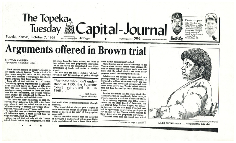 A newspaper article from The Topeka Capital Journal about opening arguments in the Topeka desegregation case. The opening day also saw the opening of testimony by expert witness for the plaintiffs William Lamson who used maps and charts to argue that the Topka School System continues to remain segregated.