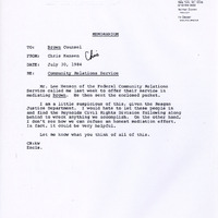 ACLU Attorney Chris Hansen writes to the members of the Brown III Counsel team to inform them that Lee Henson of the Federal Community Relations Service has offered their service in the case. Mr. Hansen is suspicious of this because of his opinion of the Justice Department under then-president Ronald Reagan.