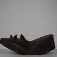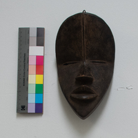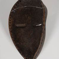 The face mask is from the Dan (Yacouba) ethnic group of Cote D'Ivoire and Liberia and is spiritually meaningful. The mask has simple facial features with small slits for eyes, a broad nose, and protruding lips and may be worn by dancers, athletes, and warriors.