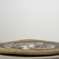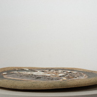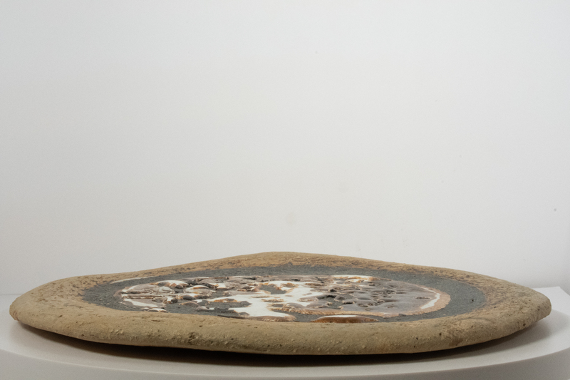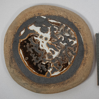This large ceramic plate created by Carroll Harris Simms features multiple textures, including a bubbling glaze covering most of the top of the piece. Simms worked alongside Dr. John T. Biggers to build Texas Southern's art department from the ground up. Simms' decorative artworks remain in high demand by collectors.
