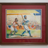 This watercolor painting by Frank Perkins features a scene at a baseball stadium. This work may be an homage to the Negro Leagues, which offered Black baseball players the chance to play professionally prior to Jackie Robinson's integration of Major League Baseball. Iconic Black baseball players like Robinson, Willie Mays, Satchel Paige, Josh Gibson, and many more played in the Negro Leagues.