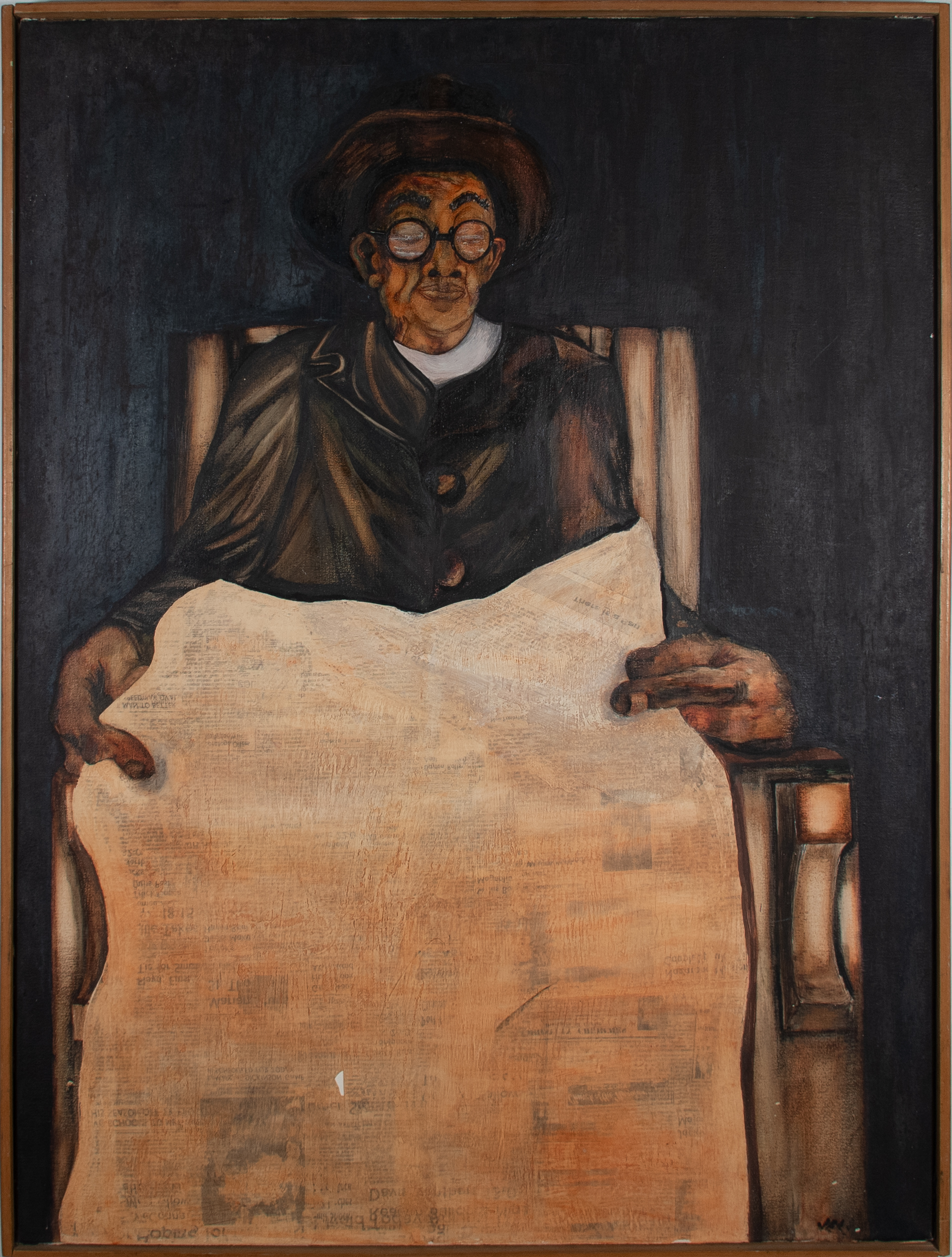 This painting depicts an older Black man sitting and reading a newspaper. The dimly lit scene is minimal and the man, his chair, and the paper are the only aspects visible, highlighting the focus of the painting. The artist cleverly incorporates real newspapers into the piece's media.