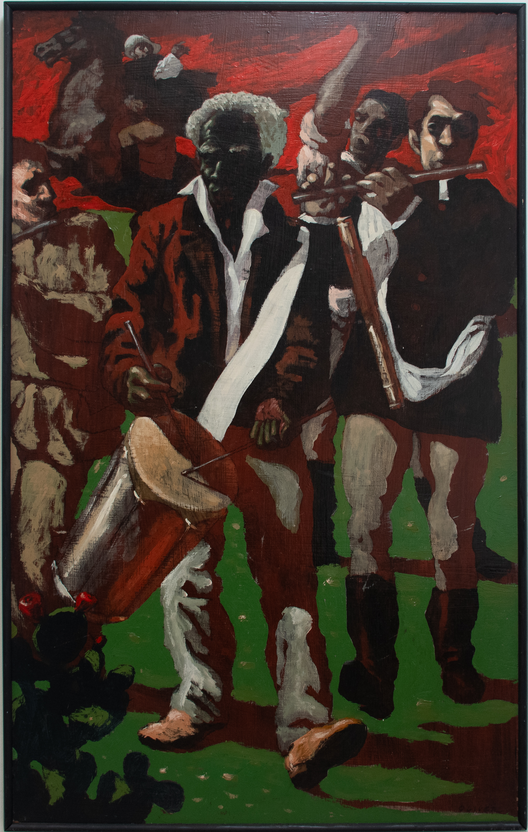 Oliver's painting depicts a group of men marching and playing drums and flutes, seemingly as part of a military expedition. The scene is believed to be drawn from the Battle of San Jacinto, the culminating battle of Texas's war against Mexico. The Black man may be Dick the Drummer, a free Black man who was part of the Texas army band.