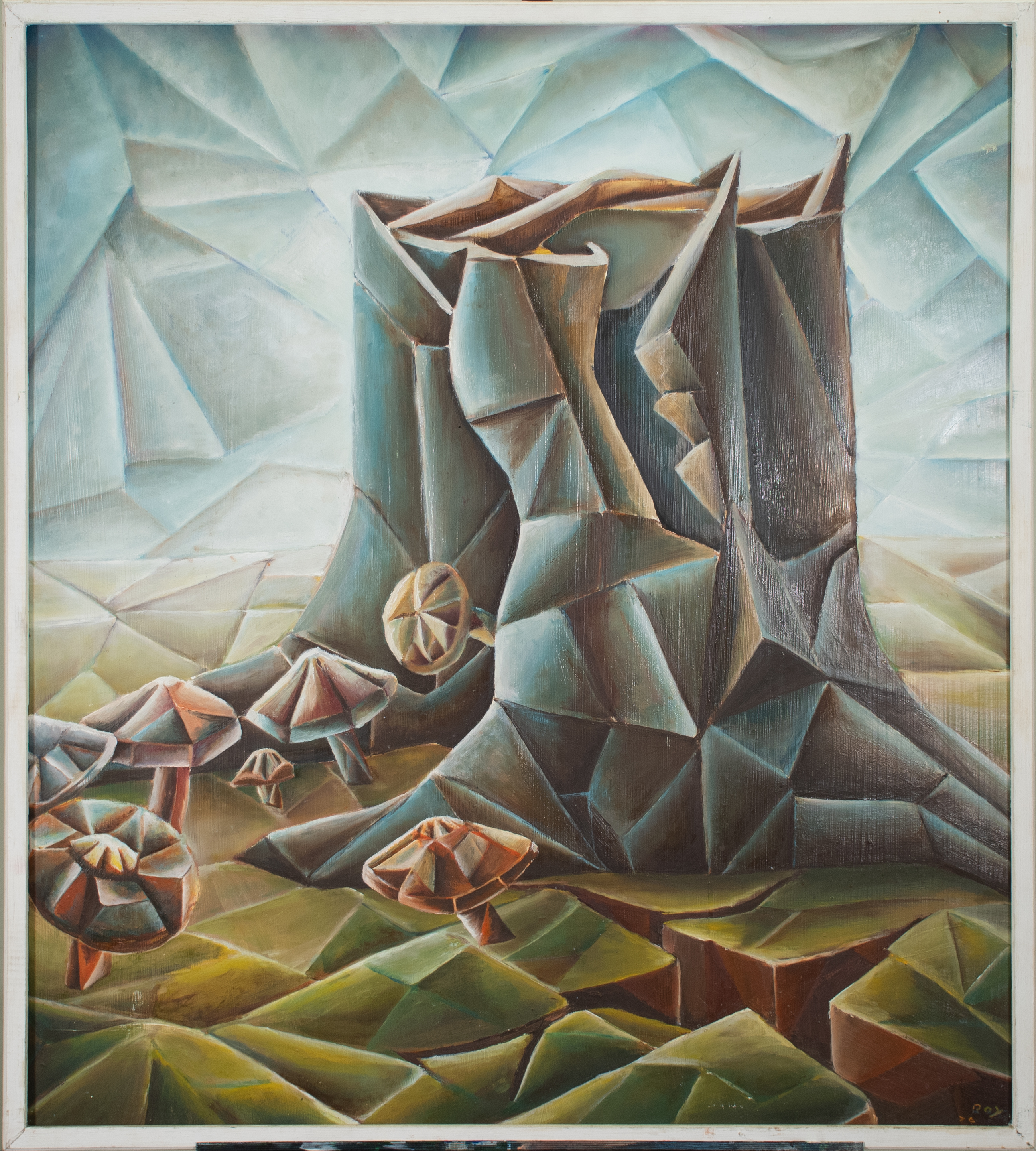 This painting by Roy Vinson Thomas is a landscape piece depicting a tree stump and mushrooms in cubist style. Cubism depicts forms using multiple geometric shapes to create depth. Many works in Texas Southern's permanent collection, particularly from the late 1970s, use this art style.