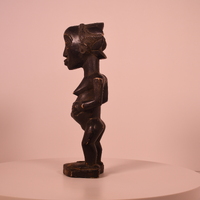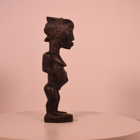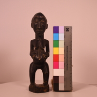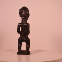 This is a Luba sculpture from the Democratic Republic of Congo of a pregnant woman holding her stomach. The Luba are a matriarchal society and often create art centered around women, placing emphasis on their importance in their society. Some suggest that these figures are used to promote fertility.