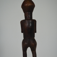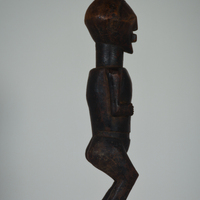 This is a simple work of a richly colored woman featuring a geometric face with oval eyes, a triangle nose, and a prominent square mouth. The sculpture has African origins, yet the specific ethnic group is unknown because of the lack of body markings and hair adornments. The sculpture has a glossy finish.