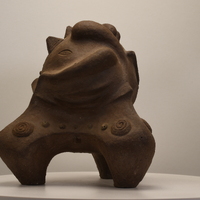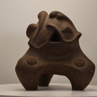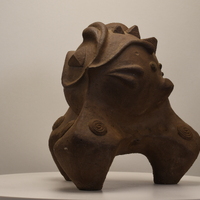 This is an abstract work featuring adornments like swirls, eyes, and pyramids. This blend of symbols suggests themes of hybridity and the fusion of cultures. Professor Carroll Harris Simms' terracotta tradition was inspired by the shrine sculptures of the Nok and Ife peoples of West Africa. In diasporic contexts, the sculptures' significance evolves.