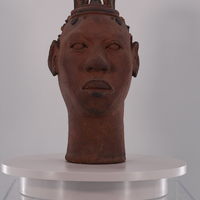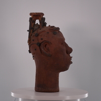 This bust is a self-portrait of the artist. Jones depicted his face with sharp features, high cheekbones, and protruding veins near the brow line. The crown is adorned with spiral motifs, dots, and rolled clay. Atop is a shrine structure, with a turtle within. Turtles and tortoises are often used to symbolize longevity. Students were encouraged to adorn their self-portraits with additional embellishments.