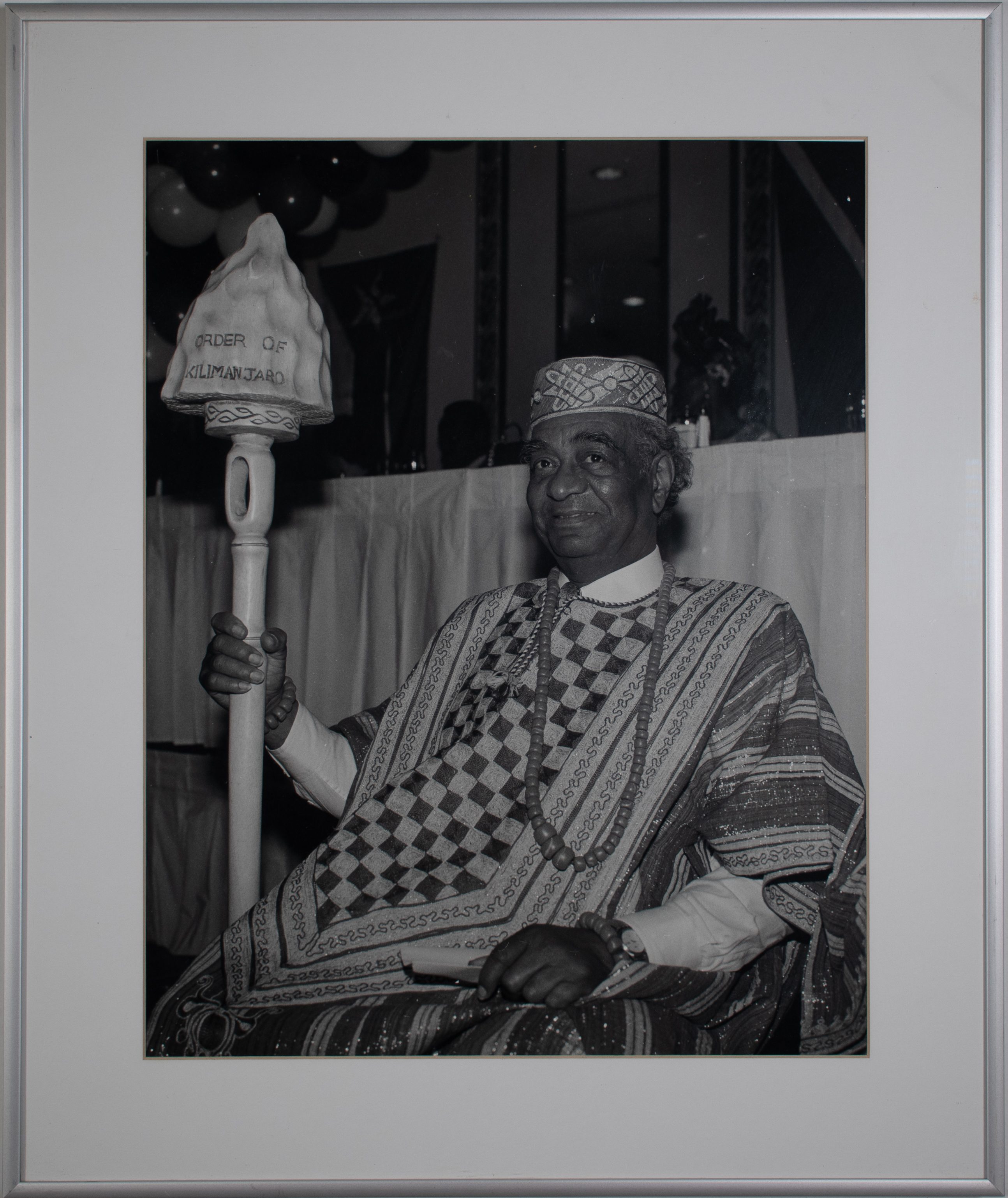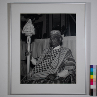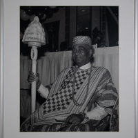 This photograph by Earlie Hudnall, Jr. shows John Biggers being inducted into the Order of Kilimanjaro, an award given to him by the African Union at an event in Houston. Africa and African roots were essential parts of Biggers' art and teachings. He is often credited as one of the first African American artists to visit Africa and begin to incorporate African art and traditions into his art.