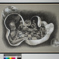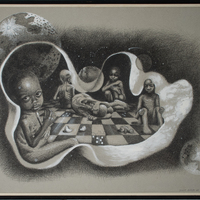 This drawing by Oliver Parson shows a group of emaciated children seated on a checkerboard patterned floor. There is also a chick, just hatched from its egg, that seems to be struggling to survive. Parson has an incredible talent for conveying powerful emotions in his works. The checkerboard and other sacred geometry imagery appear frequently in the works of Dr. Biggers's students.