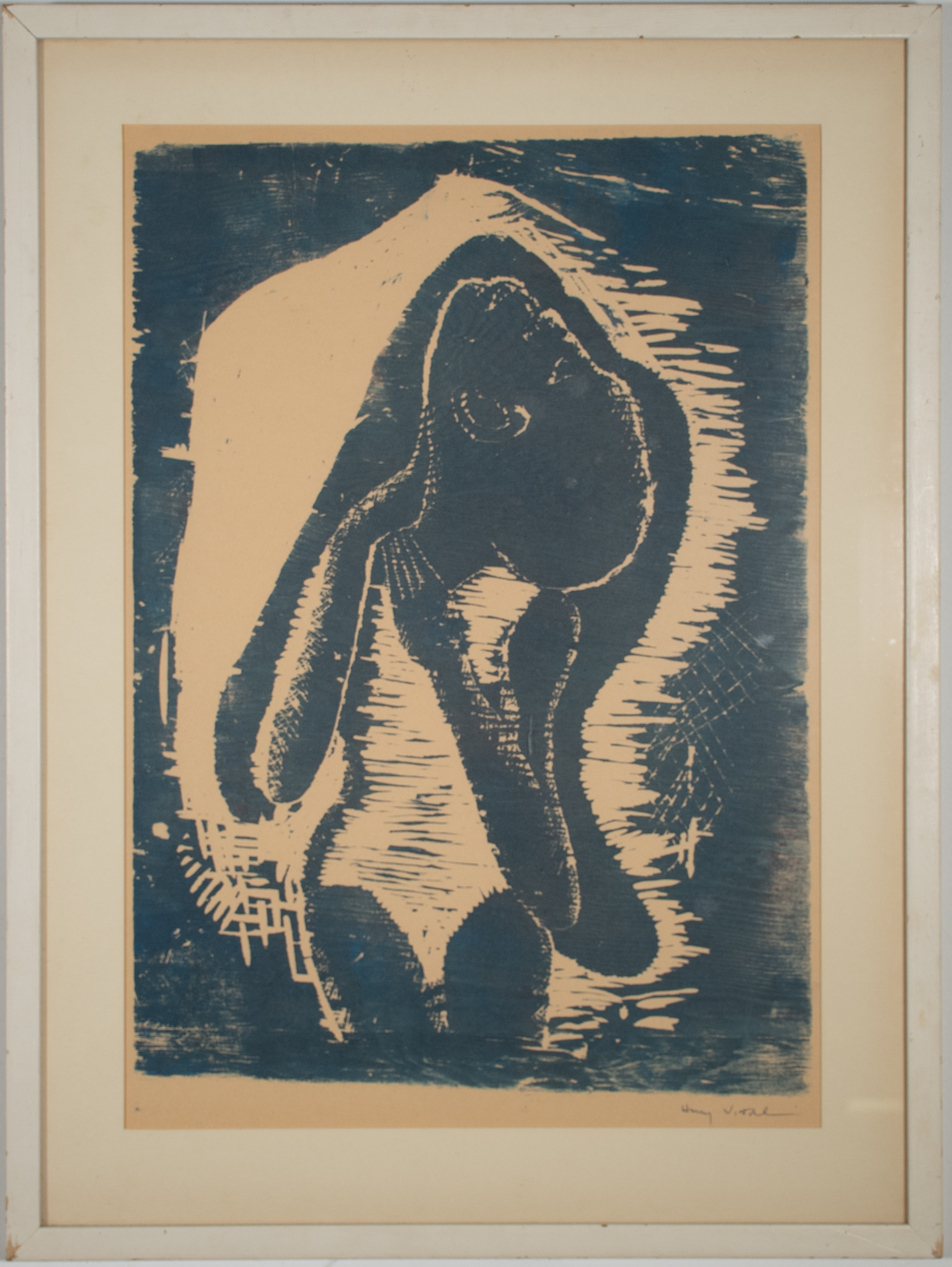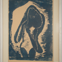 This print by Harry Vital shows a woman in a swimsuit tilting her head upwards. Dr. John T. Biggers taught students the craft of printmaking while he was a professor at Texas Southern University. Vital followed in Biggers' footsteps and became a longtime art professor at TSU.