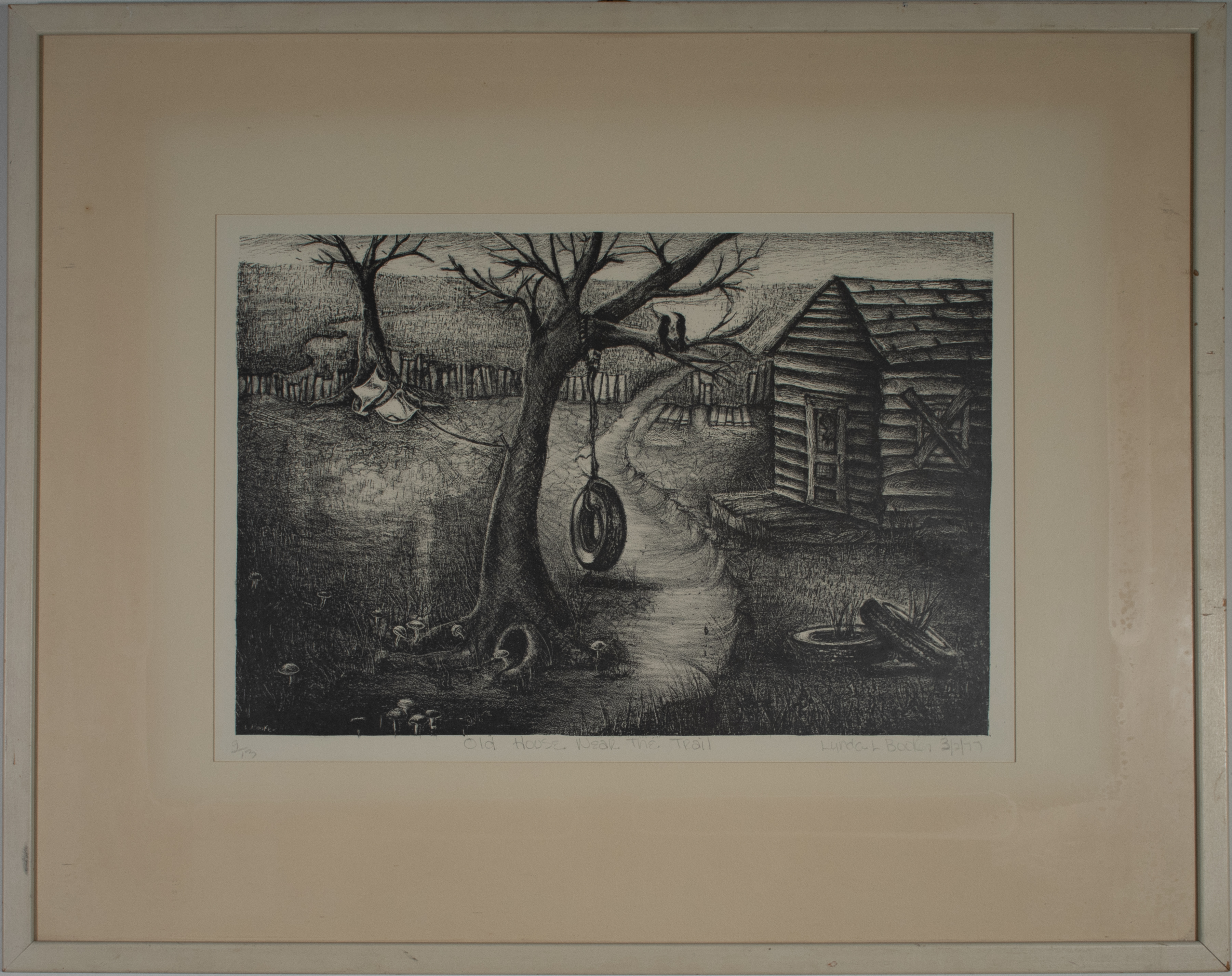 The print by Booker shows a rural landscape featuring a small, neglected house. A tire swing and clothesline hang from the two trees. The area appears not to be frequented by people, as suggested by the boarded window, overgrown weeds, and mushrooms.