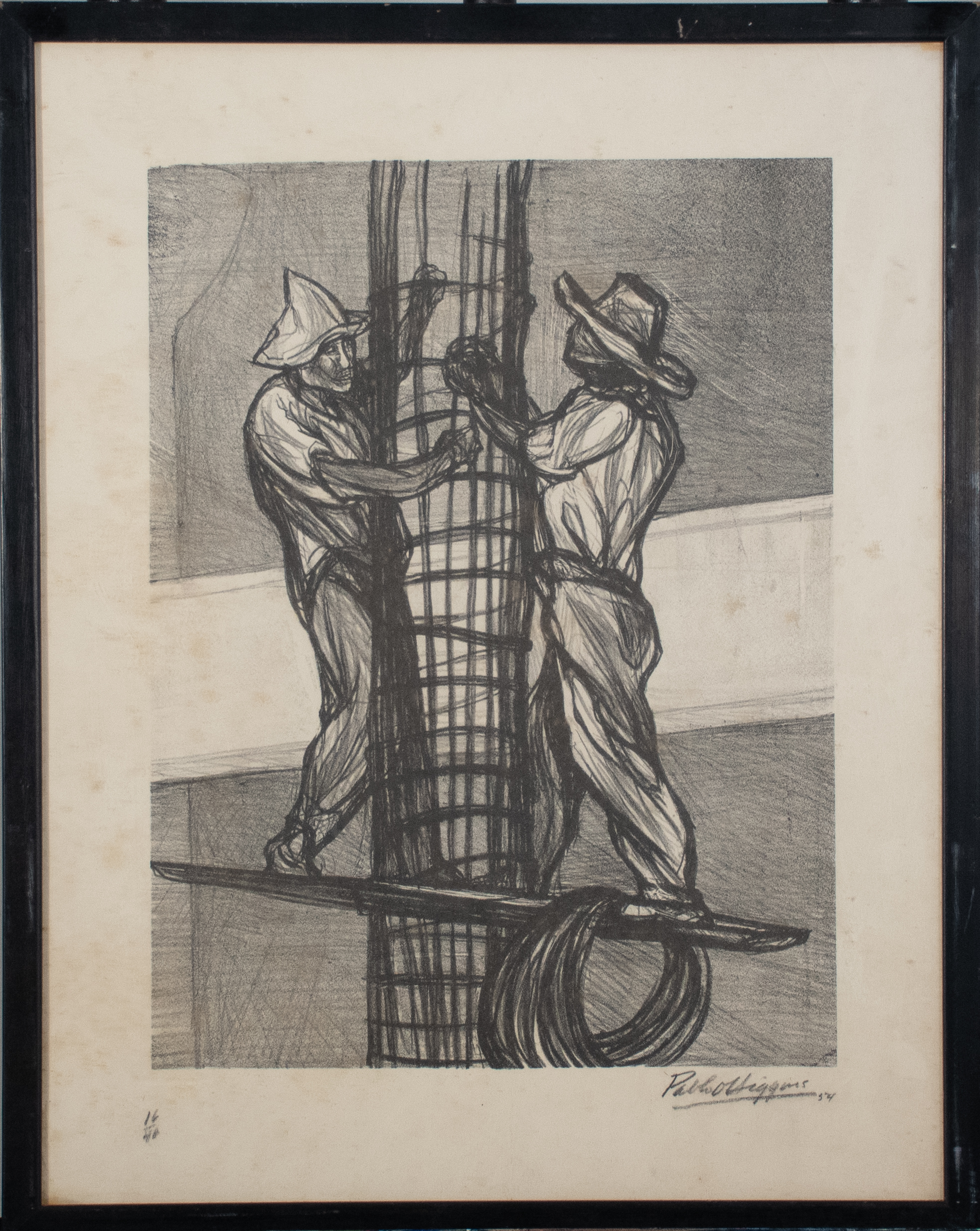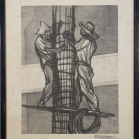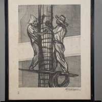 O'Higgins' print shows two men balancing on a board and working on a cylindrical structure. Unlike most of the works held by the University Museum, O’Higgins had no connection to Texas Southern; this piece was donated by a collector. O'Higgins was an established artist in the 20th century and was mentored by Diego Rivera.