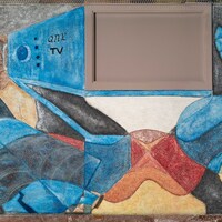 Jones’ surrealistic mural depicts bald, cyclops-like men conducting a television broadcast. Jones incorporated architecture into the design by using a window, since painted over, as the camera’s lens. A man beneath the camera carries a torch with a strong, flowing flame.