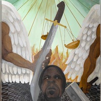 Evans’ mural features a self-portrait of the artist below the muscular arms of two angels. Above, an open book radiates light onto the setting. Evans is a founding member of Otabenga Jones & Associates, an artists’ collective founded by four former TSU students.