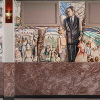 Royal’s mural illustrates the desegregation of public schools following Brown v. Board of Education (1954). In the center of the scene is attorney and future Supreme Court justice Thurgood Marshall, with Black students entering integrated schools. At the far left is Chief Justice Earl Warren.