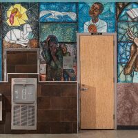 McNeil creates a scene of Black spirituality and worship, surrounding images of Black men with the traditional symbols of the cross, the lamb, the dove, and the wine of communion. Placing two of the figures against stained glass windows yields a direct connection with the interior of the Black church.