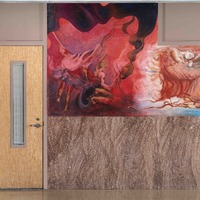 Oliver’s mural contains an homage to Frederic Leighton’s Flaming June. The central figure is surrounded by vast, flowing patterns of deep red, reddish-brown, pink, and aqua, in the midst of which two figures seem to struggle against the energized space, while the female figure remains in deep sleep.