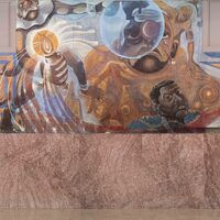 Thomas’ mural depicts an abstracted circus scene. In the center, three clowns, perhaps self-portraits, dressed in collars and muted colors, look seriously towards the viewer. The figures’ contemplative expressions stand in sharp contrast to their dress and profession.