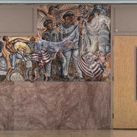 Ellison’s pair of murals speaks to political and social issues of the 1960s and 1970s. The murals express hope through resistance, in spite of the challenges facing Black America.  In the middle, a bald eagle holds a broken lynch rope in its beak and “the law” in its talons.