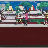 Focusing on the Sterling Student Life Center, the artist captures the lively activities of students and reflects the importance of Black fraternities and sororities in HBCU student life. Realism is paired with the surreal imagery of fantastic figures dancing around the music blasting from a boombox.