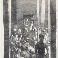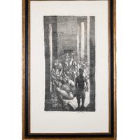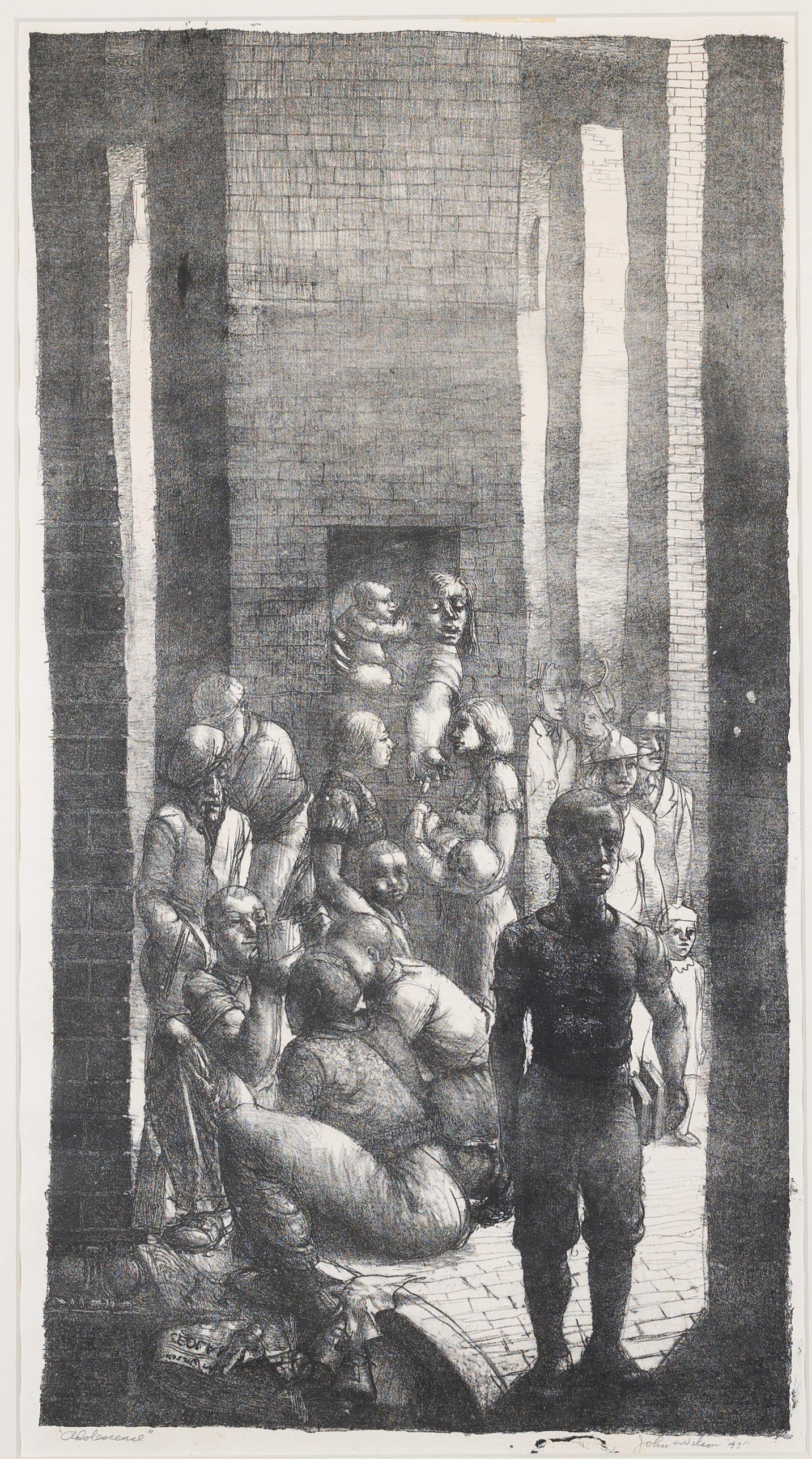 John Woodrow Wilson, a sculptor, painter, and printmaker from Roxbury, MA, was known for his creative portraits and stylistic approach to social justice. Adolescence is a sketch depiction of the social interiorities of urban life. A young boy faces the viewer in the foreground while groups of people socialize in the background.