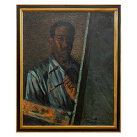 Frederick C. Flemister, native to Jackson, GA, was a student of Hale A. Woodruff at Atlanta University in the 1940s. Self-Portrait is an impressionistic piece depicting Flemister preparing to paint. He is standing in front of a canvas while holding a paintbrush in his left hand and a palette in his right.