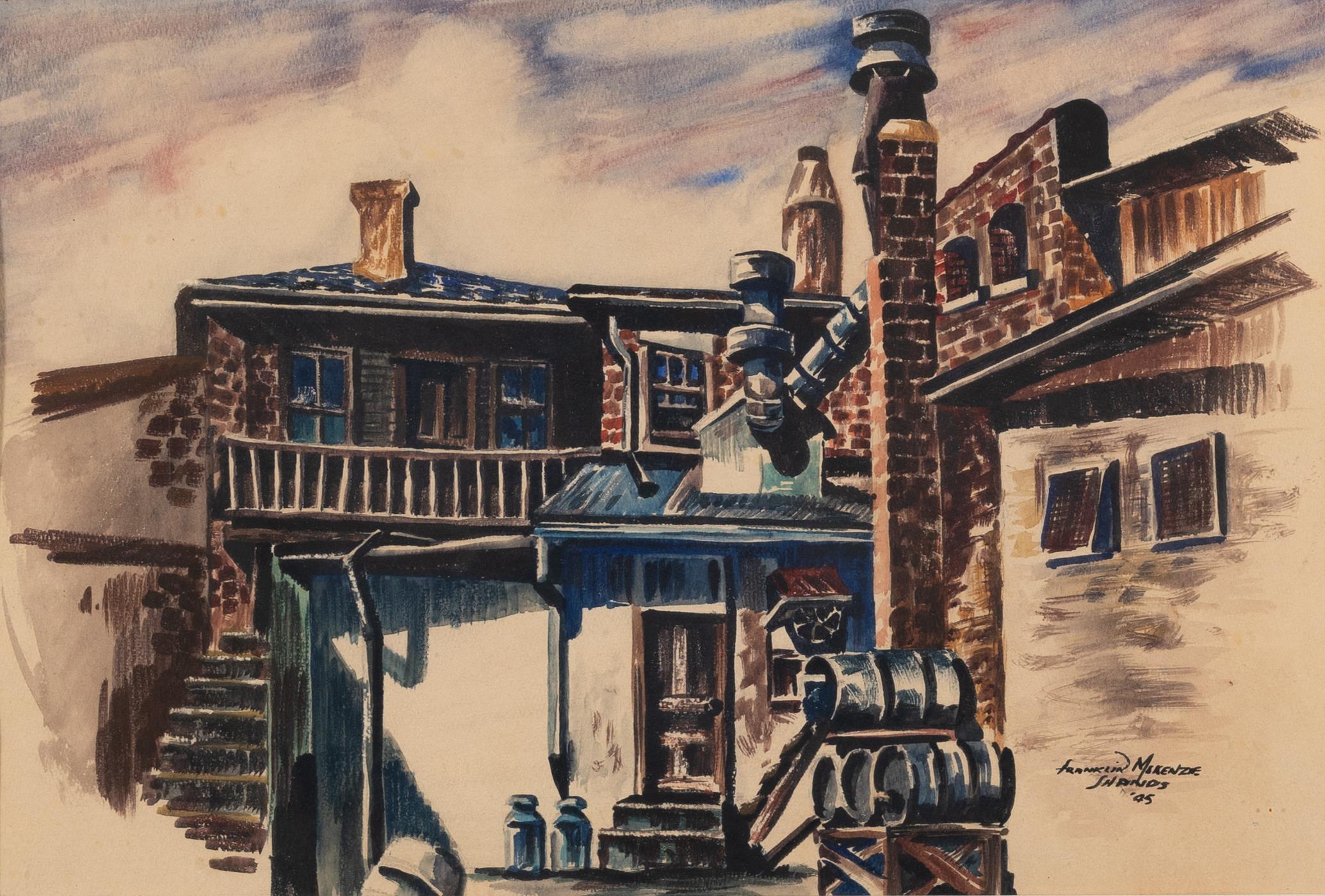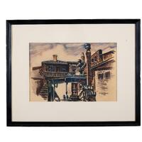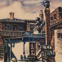 Franklin Shands was a painter from Cincinnati, Ohio. Back Way shows the back perspective of conjoined brick buildings with chimneys, a staircase and a balcony. A door sits at the center of the painting, with four stacked barrels on the right.