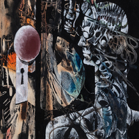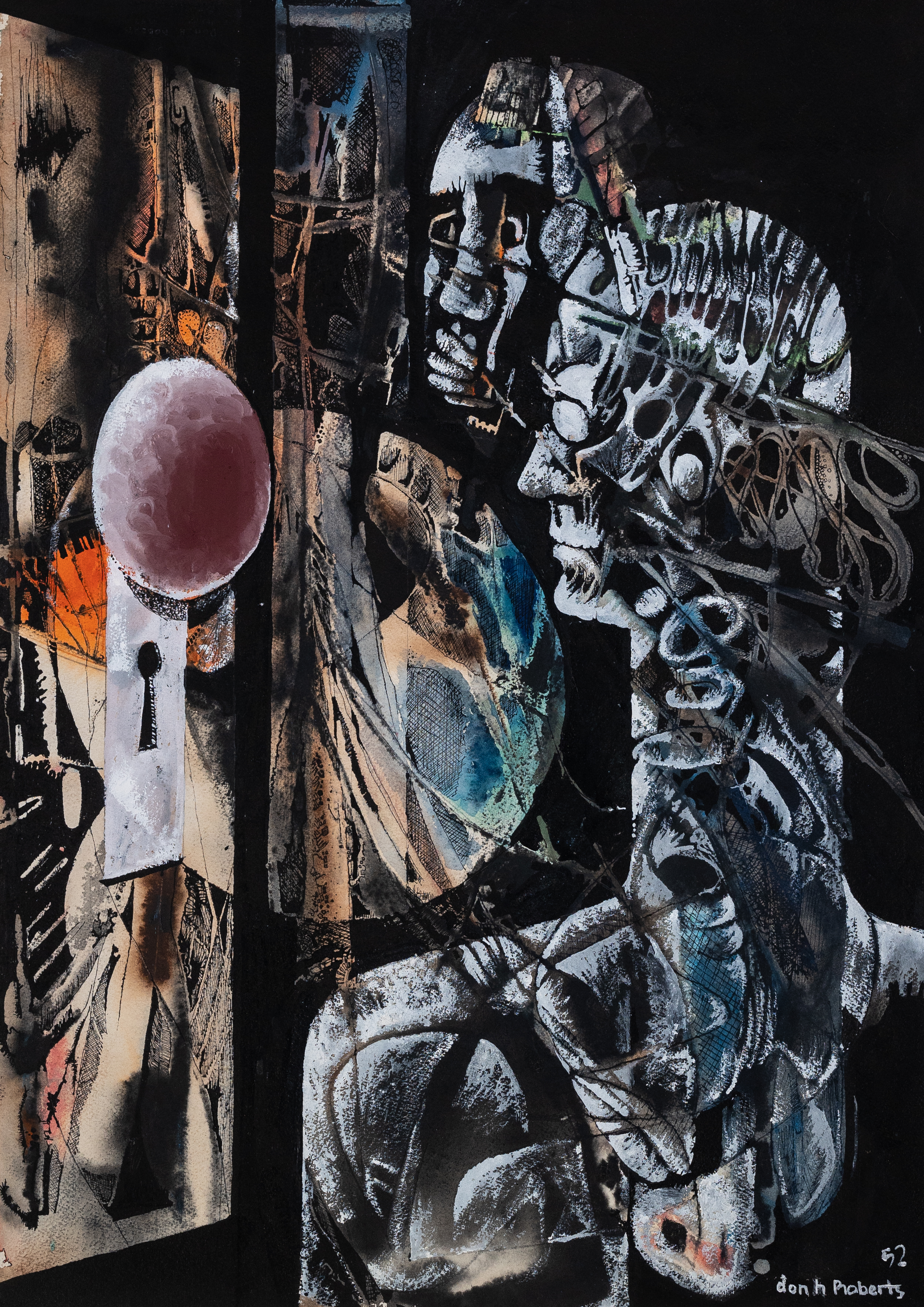 Donald H. Roberts was a painter, photographer, architecture professor, and U.S. Army Vet from Washington, D.C. The Uninvited depicts a technofuture centering a humanoid machine. The humanoid machine is looking toward a keyhole with refracted images surrounded by a dark void.