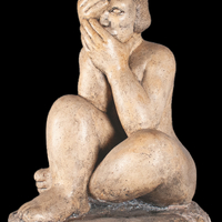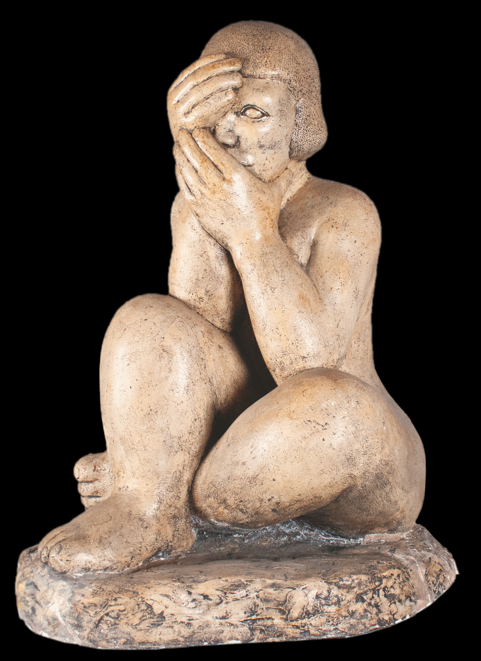 Hayward Oubre was a multimedia artist and educator from New Orleans, LA. In a Pensive Mood is a sculpture of a woman sitting in a worried position. Her hands cover her mouth and right eye as she sits with her left leg tucked under her right.