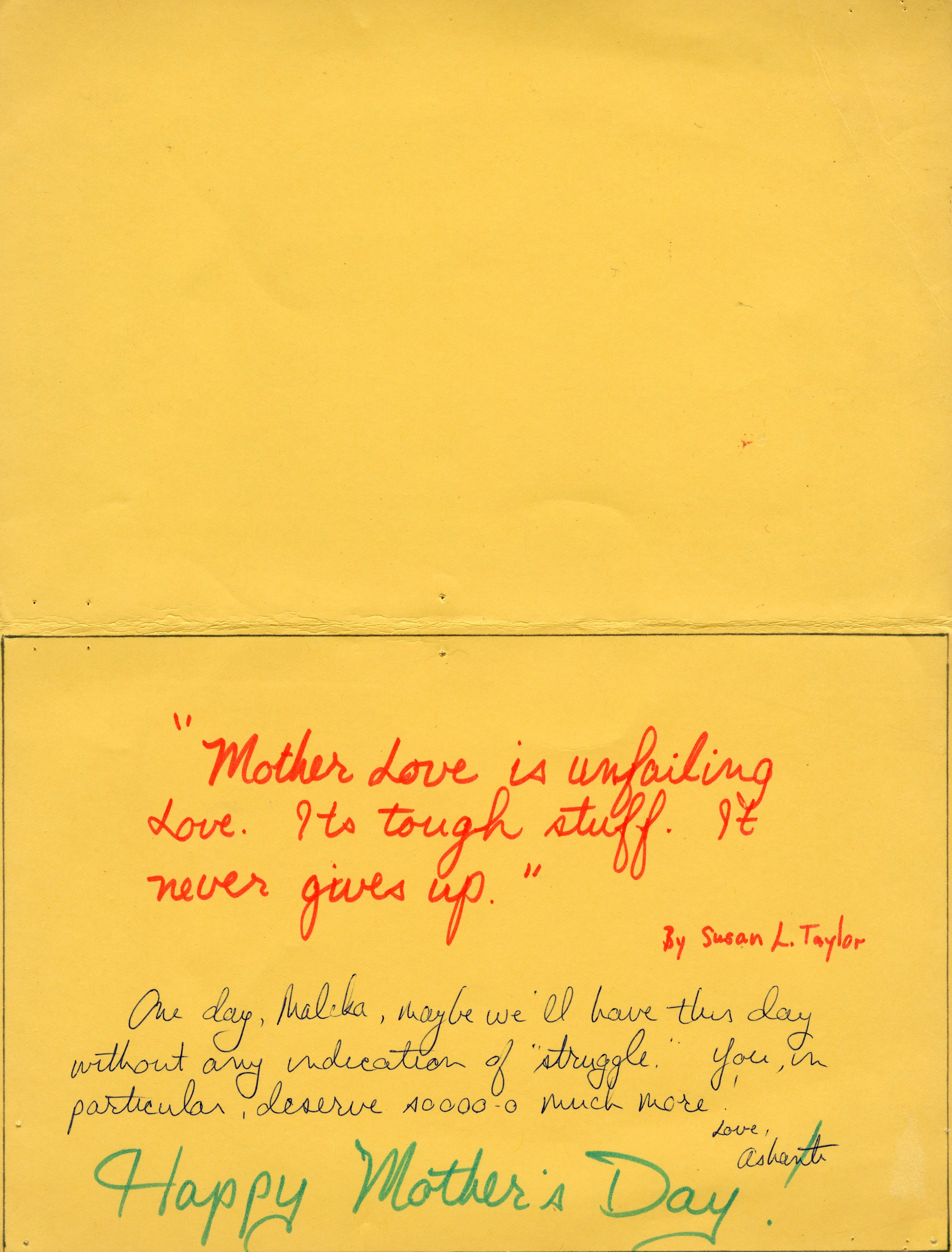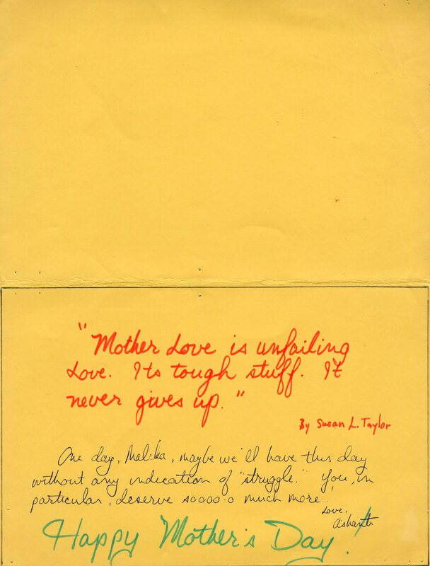 Mother's Day card from Ashanti Alston to Frankye Adams-Johnson (Malika), May 1984.