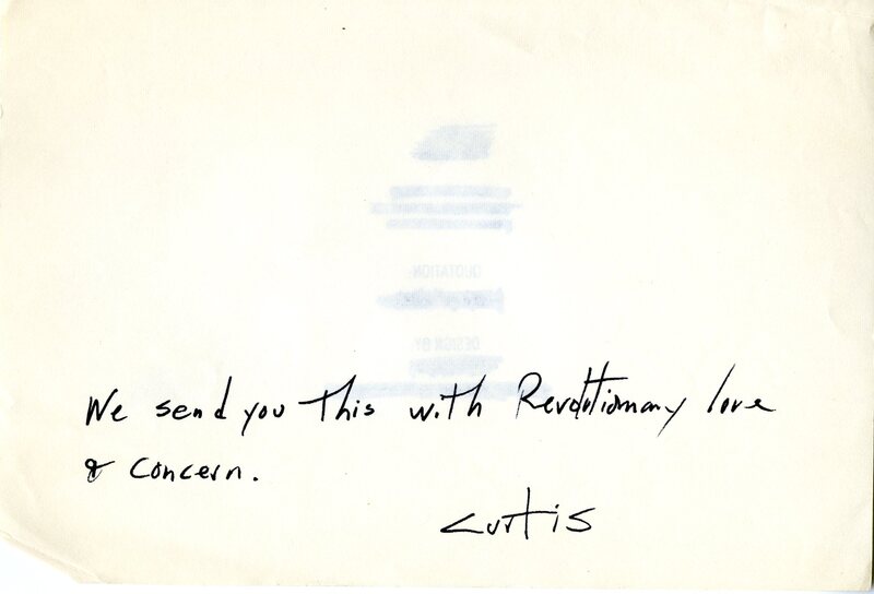 Part of Card from Black revolutionary and friend Curtis to Frankye Adams-Johnson (Malika), unknown date.