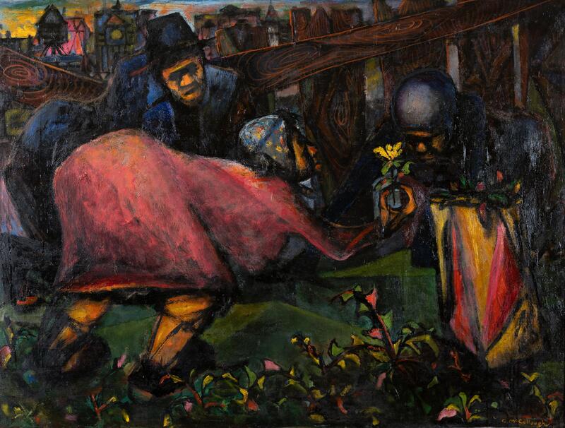 Geraldine McCullough, trained at the Art Institute of Chicago, captured both hardship and hope. In her award-winning Of Hope (1957), a yellow flower held by a central figure glows against a bleak background, a symbol of optimism in an era of repression. Later, her welded metal sculpture Phoenix drew on scrap materials to evoke rebirth from racial violence.