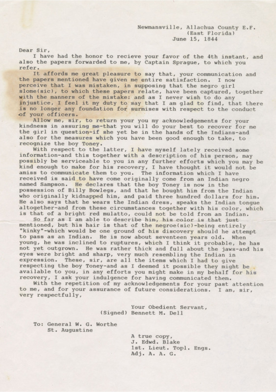 Its author, Bennett M. Dell, wrote to General W. G. Worthe in the aftermath of the Second Seminole War. At first glance, the letter seems like routine communication between two white officials. But on closer reading, it reveals the entangled realities of slavery, Indigenous resistance, and settler colonialism in territorial Florida.