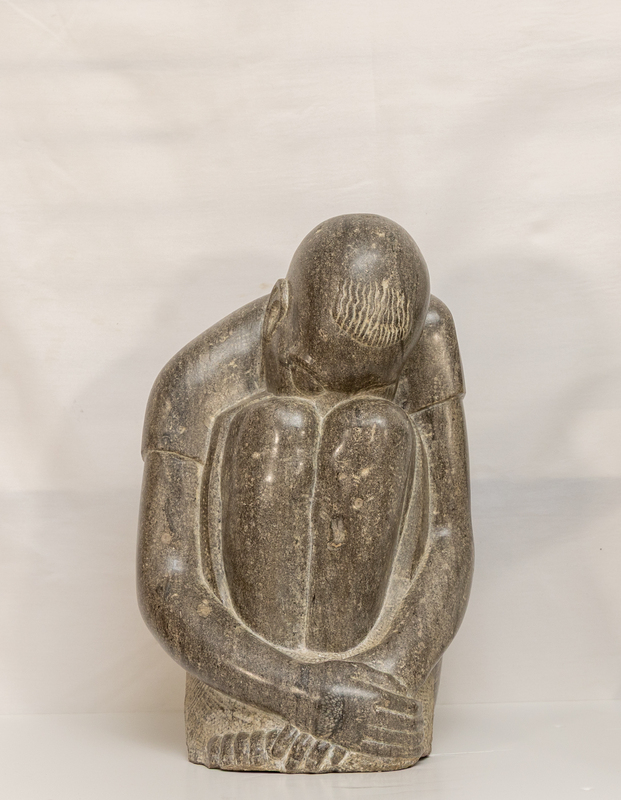 John T. Biggers was an educator, painter, and muralist from Gastonia, NC. Mother and Children depicts a woman sitting with her legs crossed and a baby in her lap. The baby’s face is hidden as they are turned downward in the woman’s lap. The woman hunches over the baby, folding her arms while looking down.