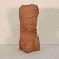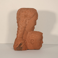 Marion Perkins was a sculptor from Marche, AK. Mother and Child is a limestone bust of its namesake. The mother is placed behind the child as she holds his head. The mother looks toward the viewer as the child looks away.