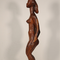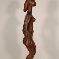 John W. Rhoden was a renowned sculptor from Birmingham, AL. Female Figure is a wooden sculpture of a nude woman. The woman's demeanor is peaceful, and she stands slack-armed with a relieved expression.