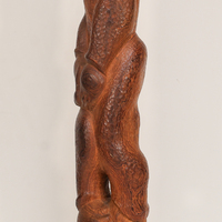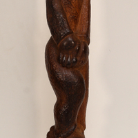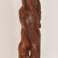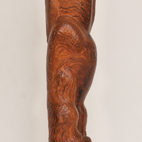 Charles W. Stallings was a painter, printmaker, sculptor, and educator from Gary, IN. Tragic Figure is a sculpture of a gender-ambiguous person standing on a pedestal. The subject adopts a demure pose as it stares over its shoulders toward the viewer.