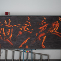 Oliver's painting shows a group of shirtless men looking towards an unseen figure or force. The painting makes heavy use of crosshatching and red and black hues. The composition bears significant resemblance to Oliver's mural Fire Fighters, which can be seen in the 1978 book, Black Art in Houston: The Texas Southern University Experience.